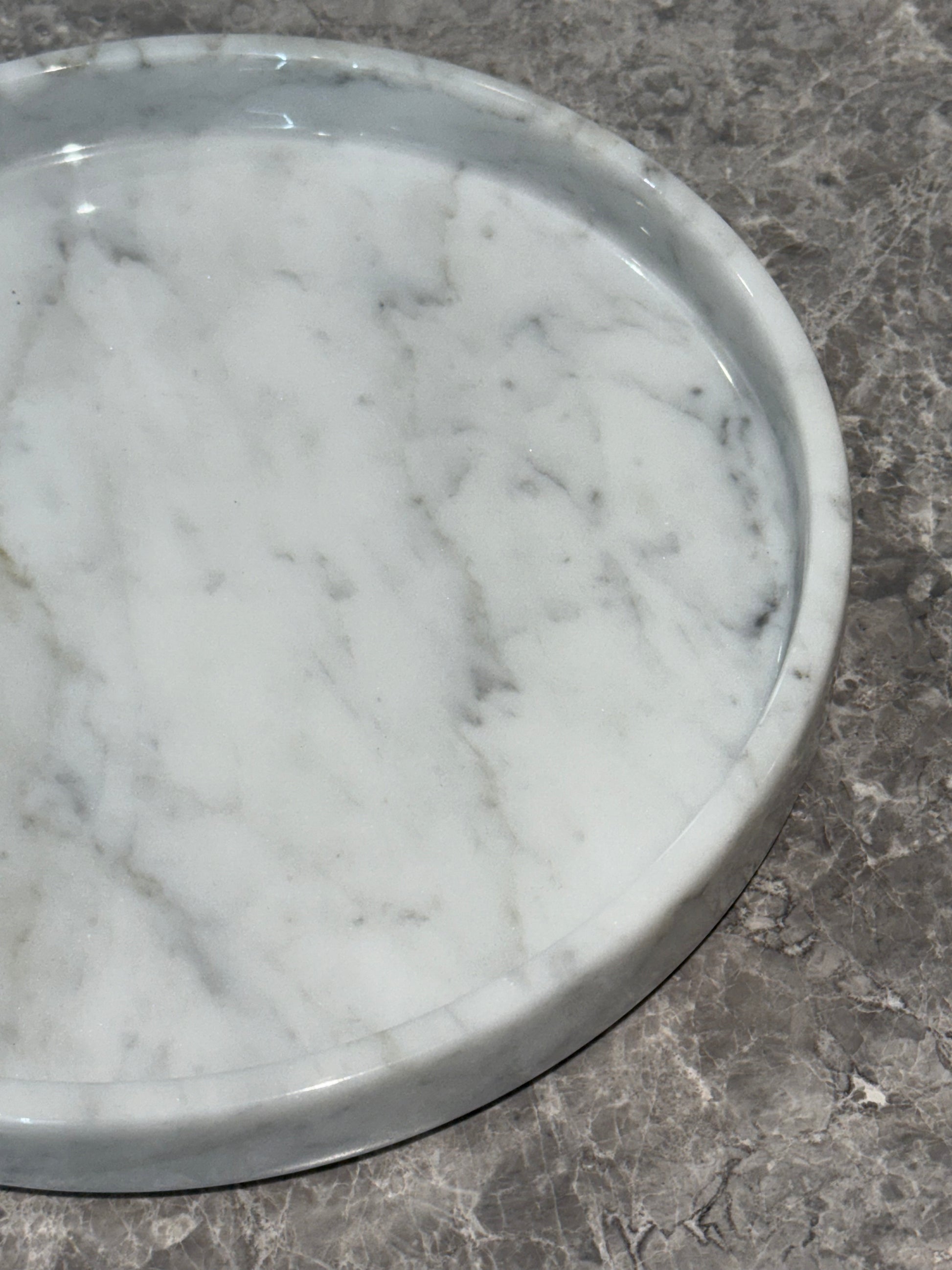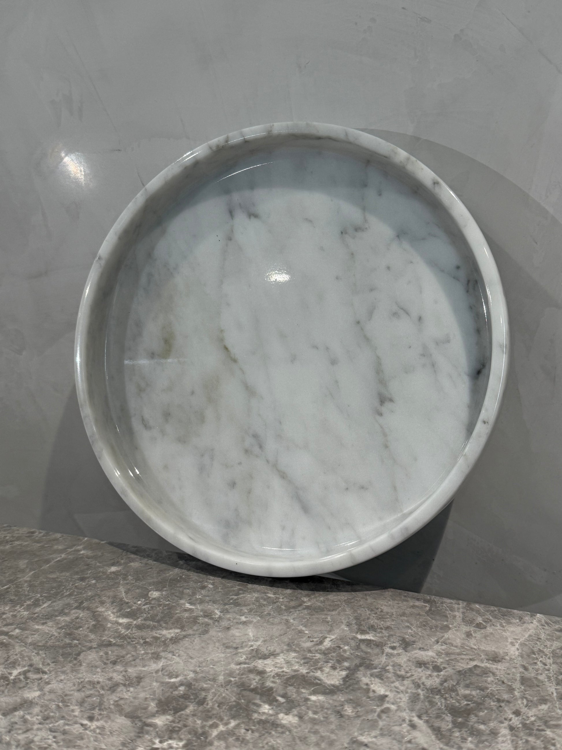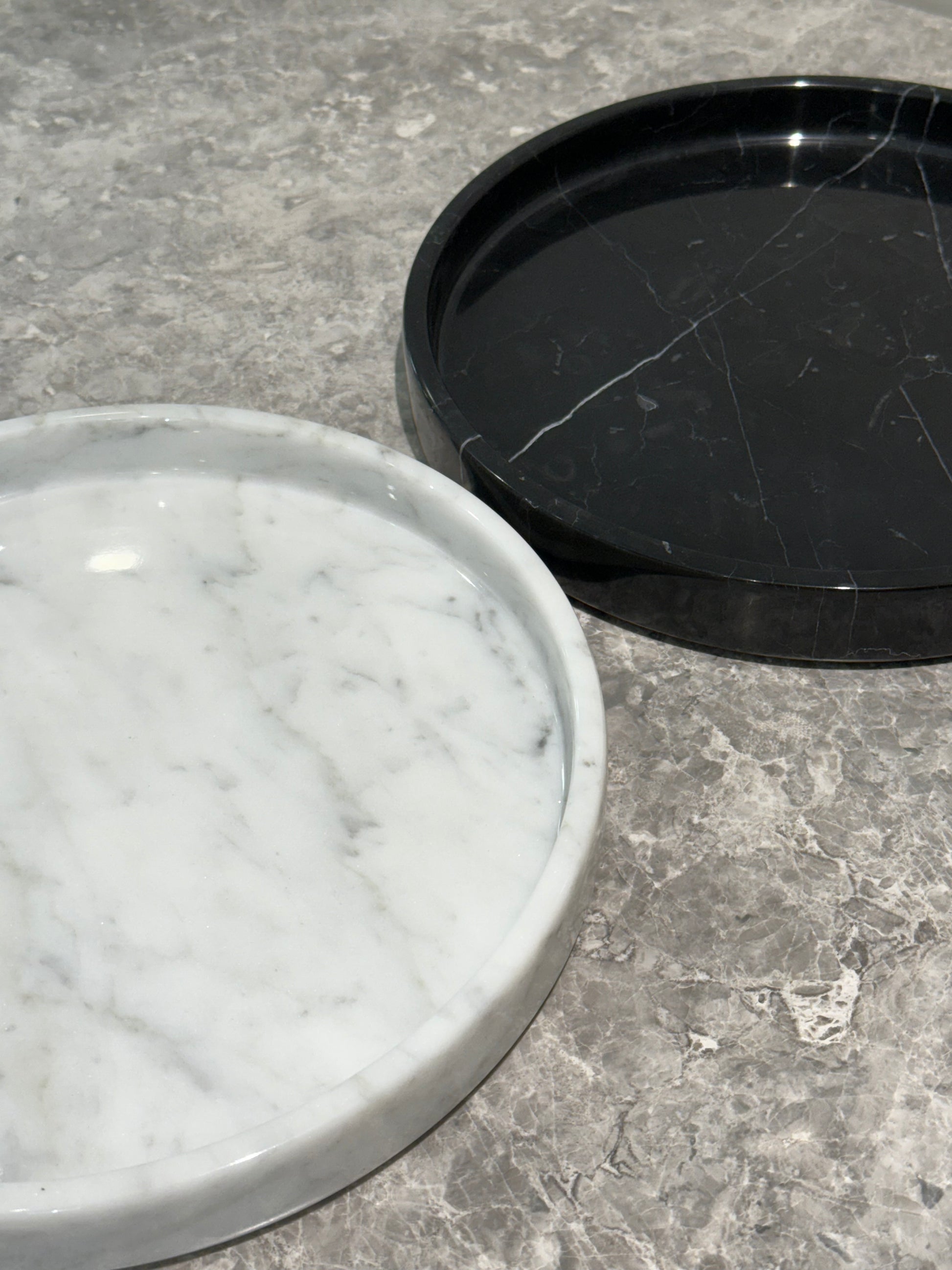A sculptural round plate hand-crafted from Bianco Carrara marble, defined by its deep black base and striking white veining. Minimal in form yet dramatic in presence, Il Vassoio serves as both a functional tray and a statement piece.