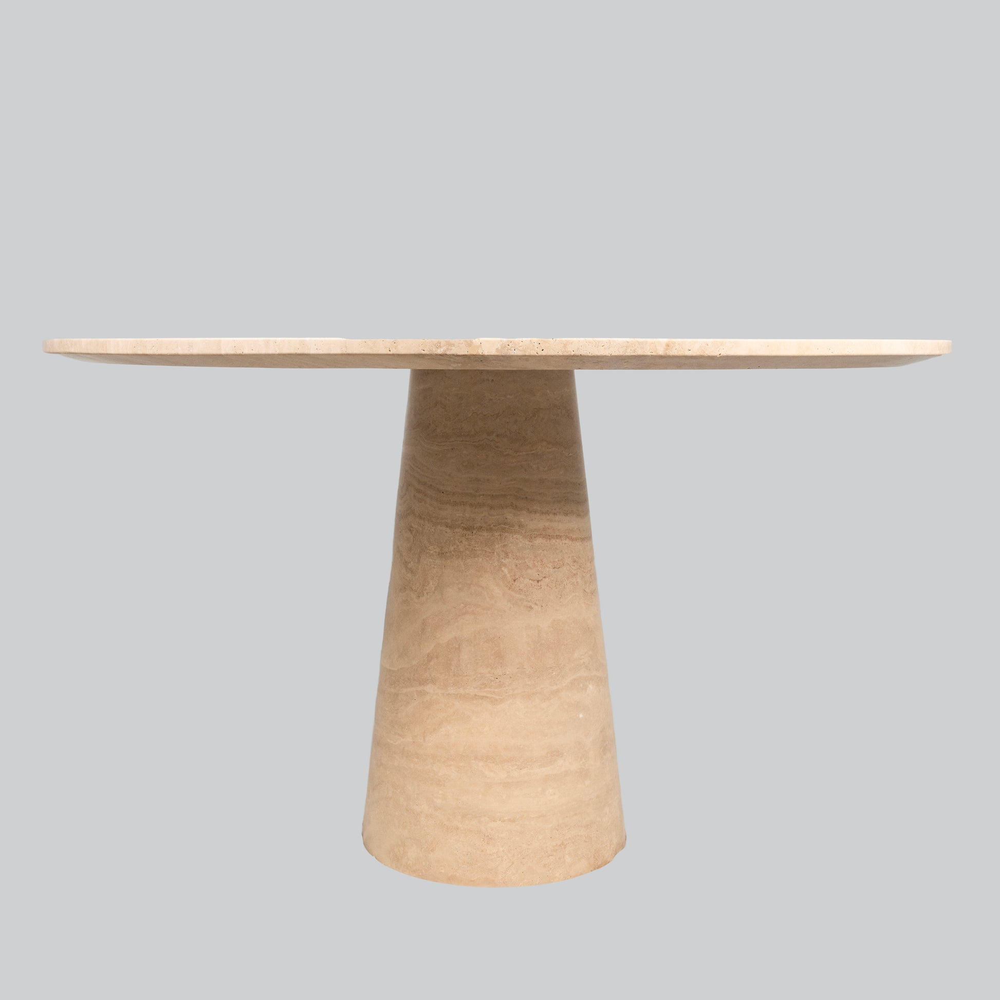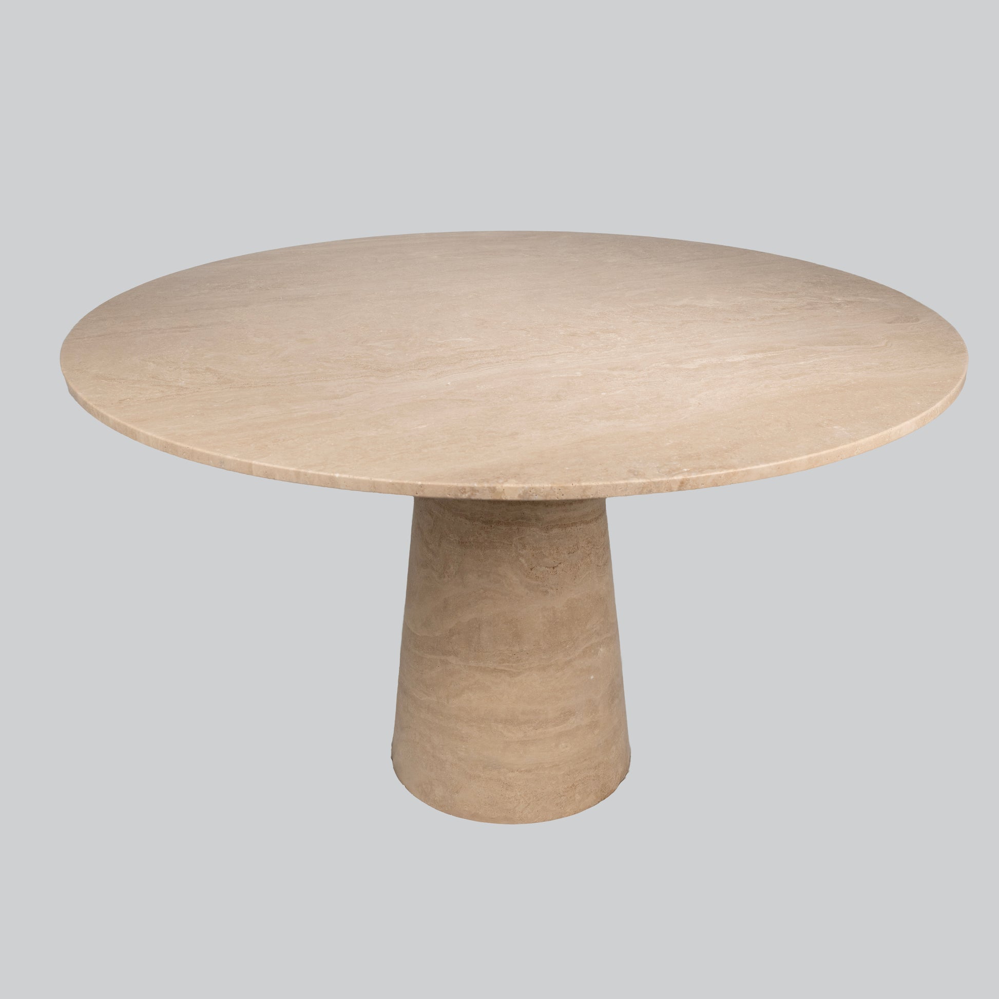 sculptural travertine islet in calm water. A generous 1.3-metre circular top rests on a