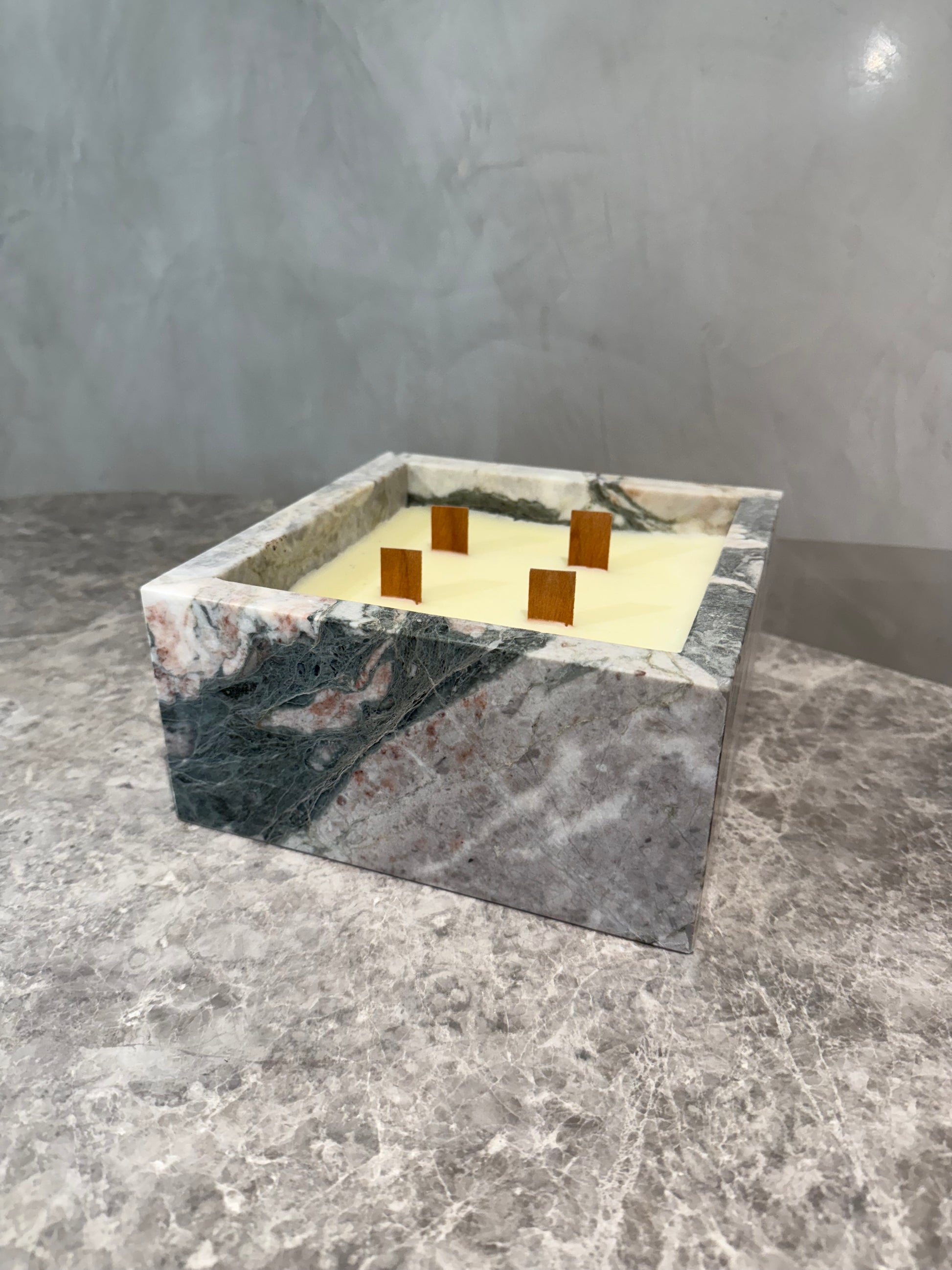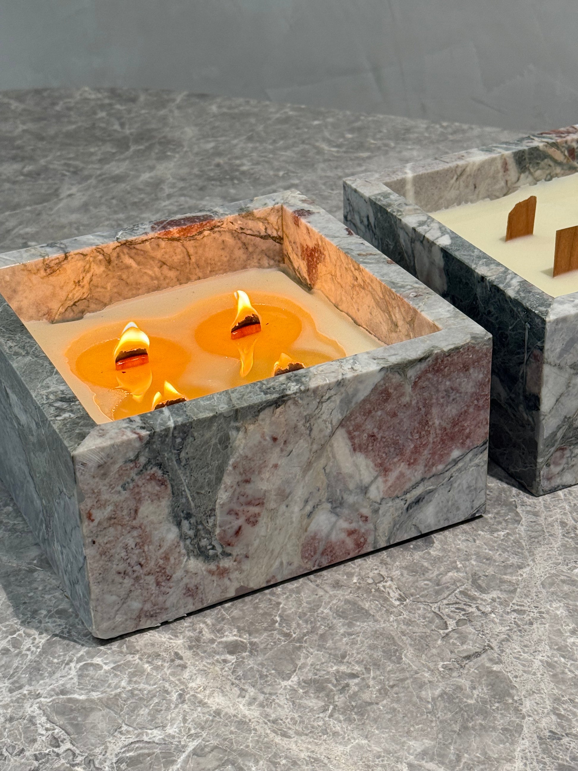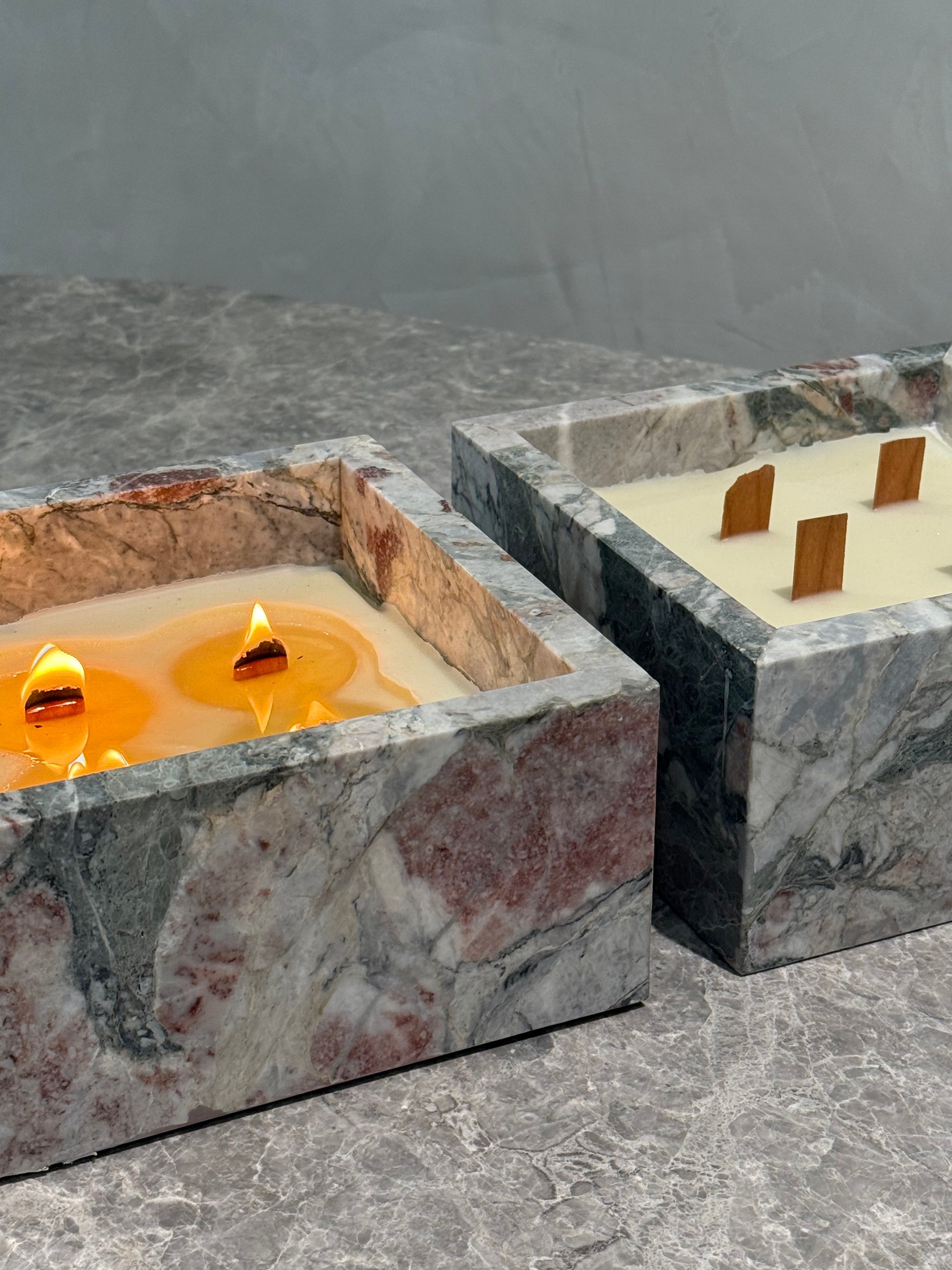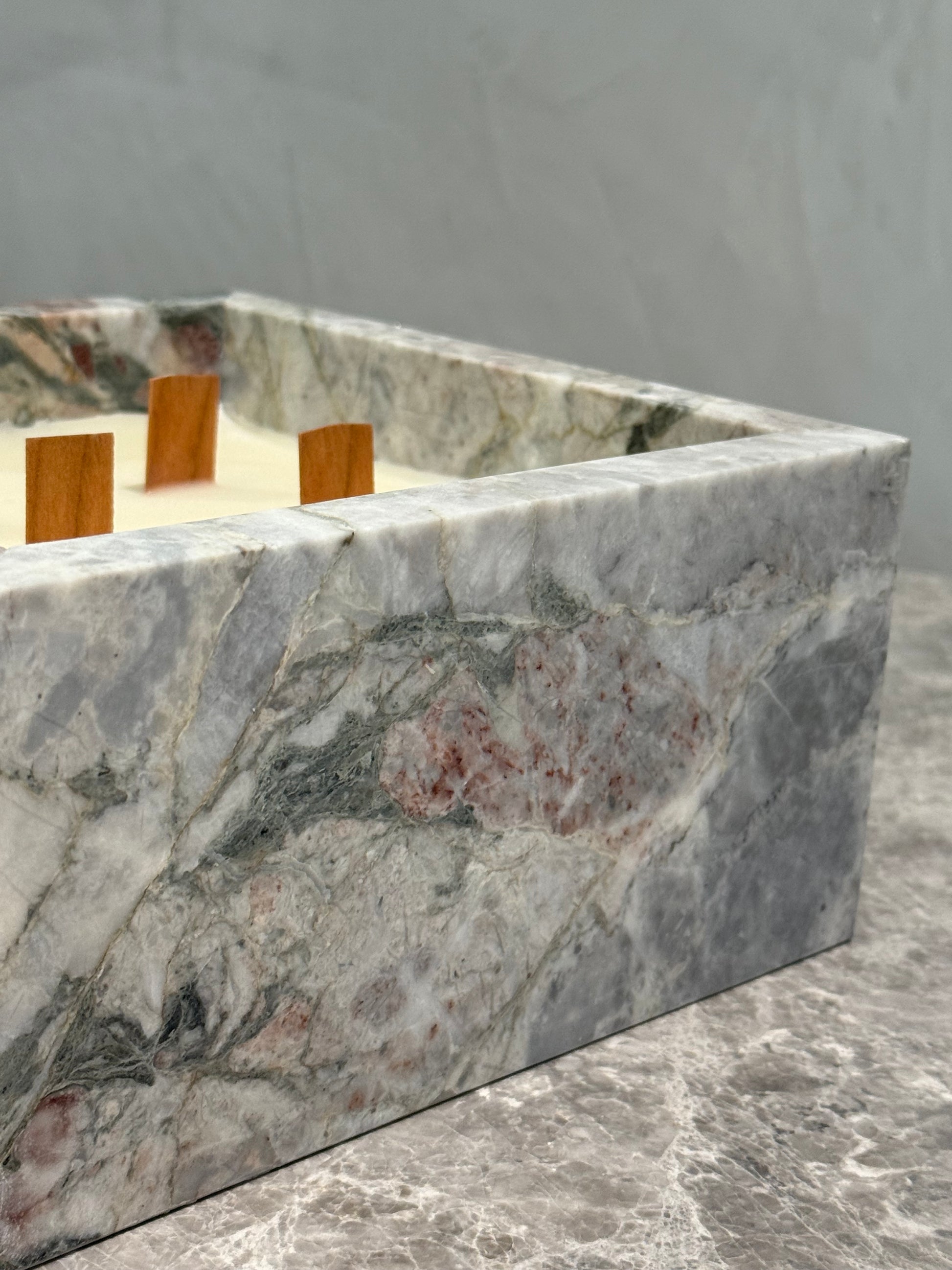 Hand-finished and polished to reveal the natural movement of the stone, each piece is one-of-a-kind, blending raw beauty with refined craftsmanship. The generous candle offers a long-lasting burn, while the stone base adds weight and permanence to the sensory experience.