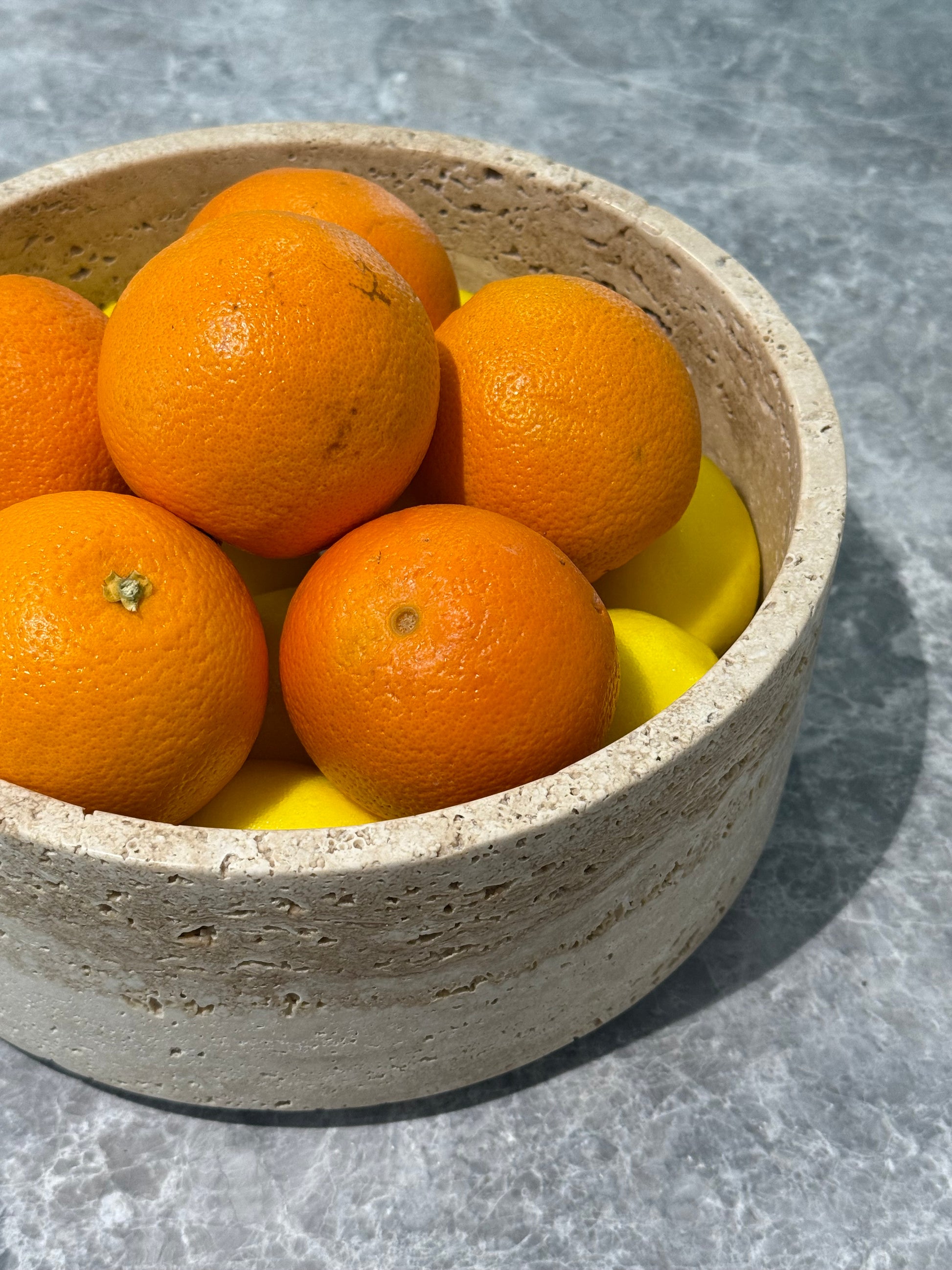 Carved from a single block of authentic Silver Italian Travertine, this substantial bowl is honed by hand to a velvety matte finish. Its clean, sculptural lines spotlight the stone’s naturally layered veining, delivering an understated statement piece that balances raw material beauty with refined craftsmanship.