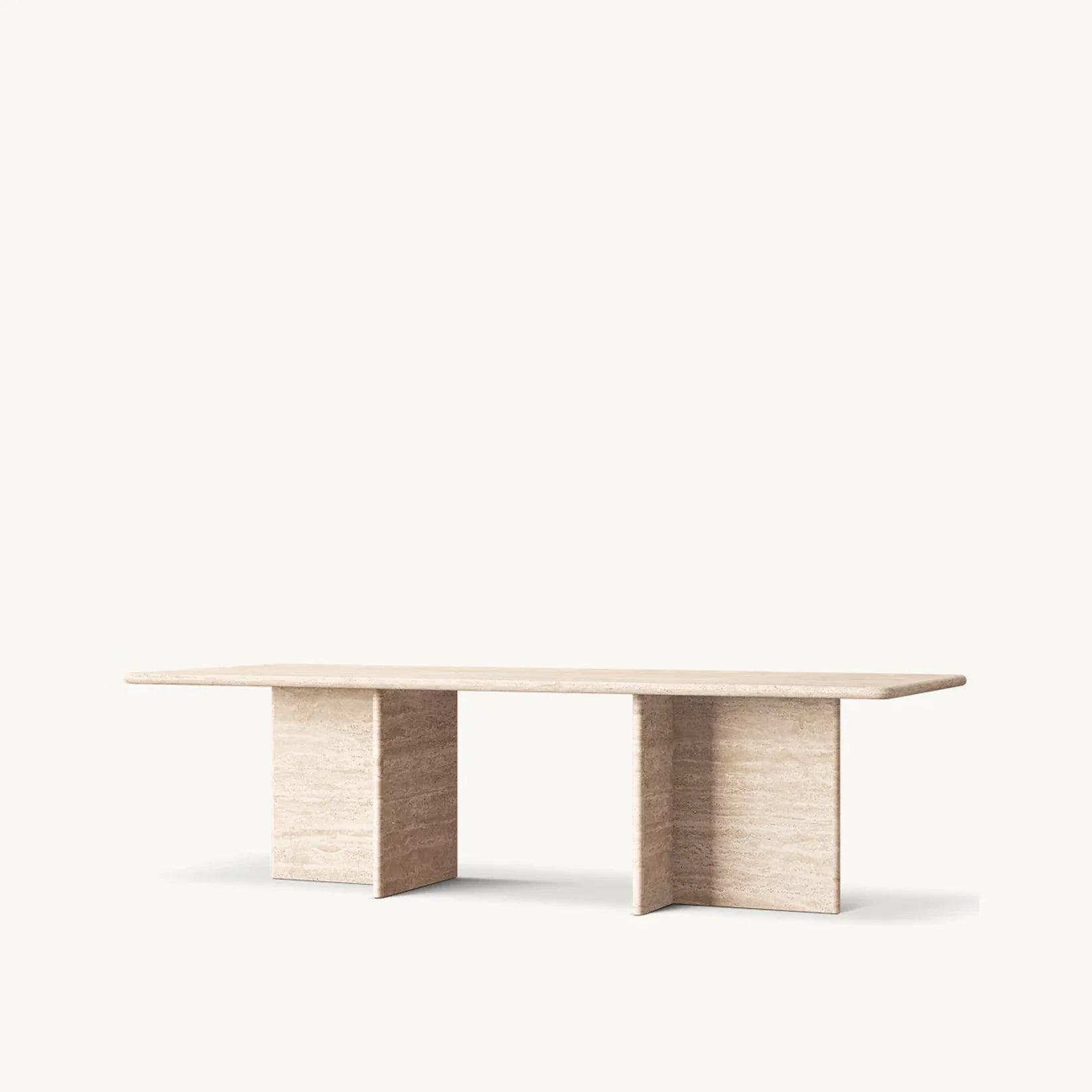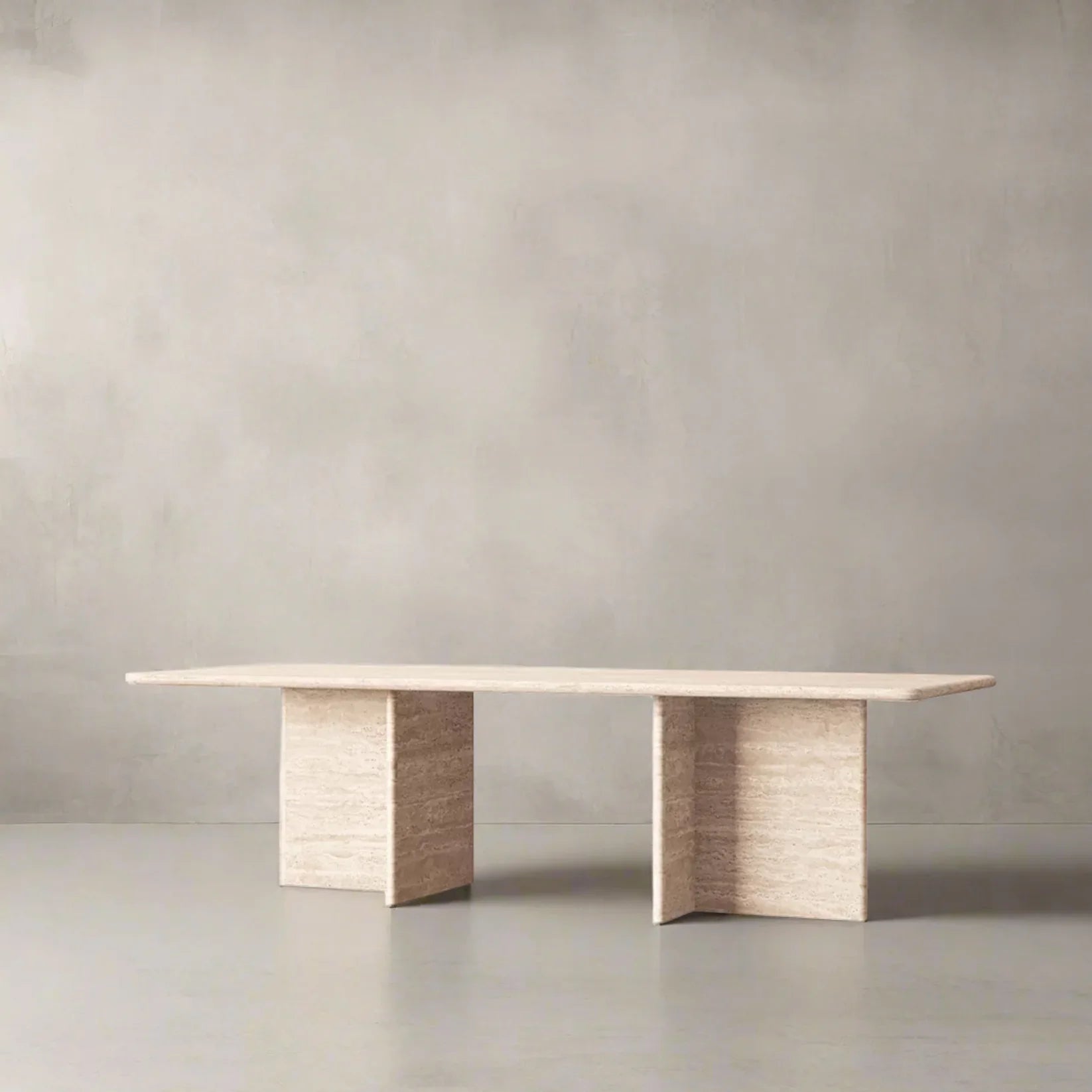 The Rivo Dining Table is a striking blend of modern design and timeless craftsmanship. Its sleek rectangular travertine top showcases natural veining and warm tones, creating a sophisticated centerpiece for any dining space. Supported by thoughtfully designed legs, the table balances strength and elegance, making it both functional and visually captivating. Fully customizable in stone, finish, and size, the Rivo Dining Table adapts seamlessly to your interior or project, perfect for intimate dinners or larger gatherings.
